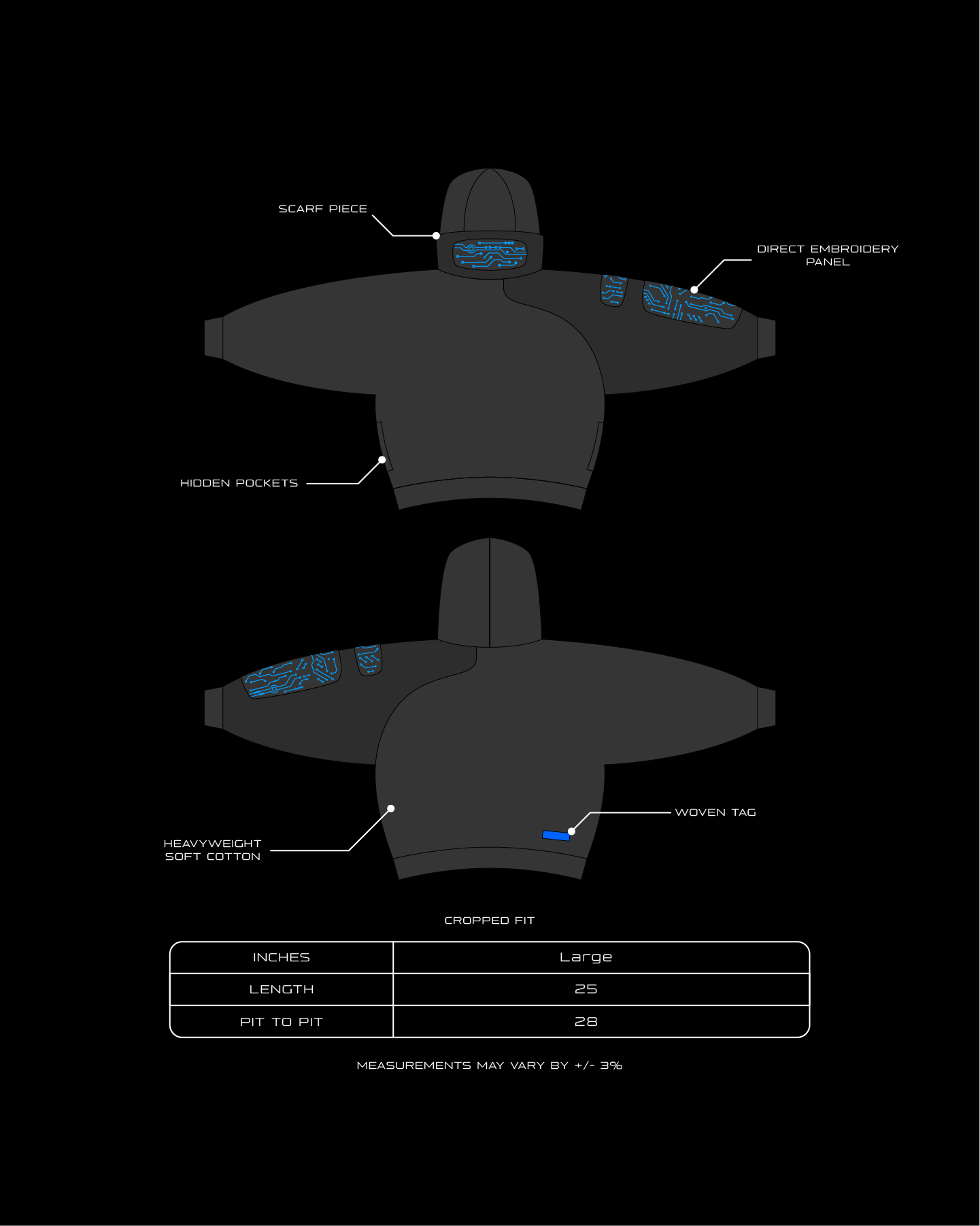 • Direct embroidery on front and sleeve panels